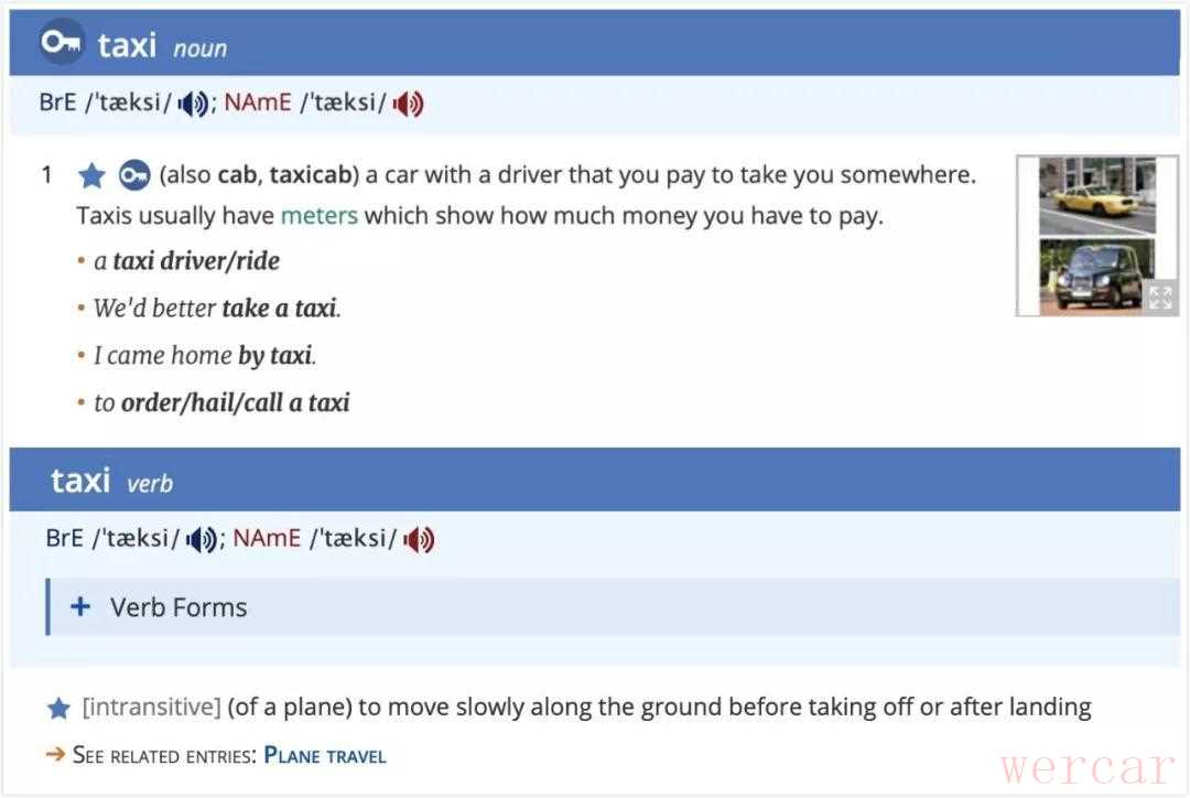 做名词时,就是我们非常熟悉的“出租车”。在美国某些地区,“出租车”也叫cab,其实无论taxi还是cab都来自同一个词:taxicab(出租车),这是完整说法。