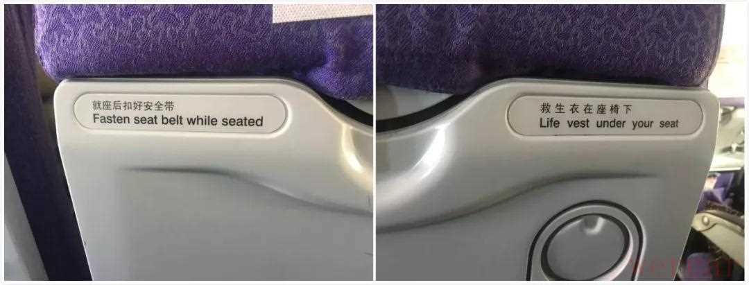 当你在飞机上就坐,平视前方座椅靠背时,一定能看到左右两边的英文: