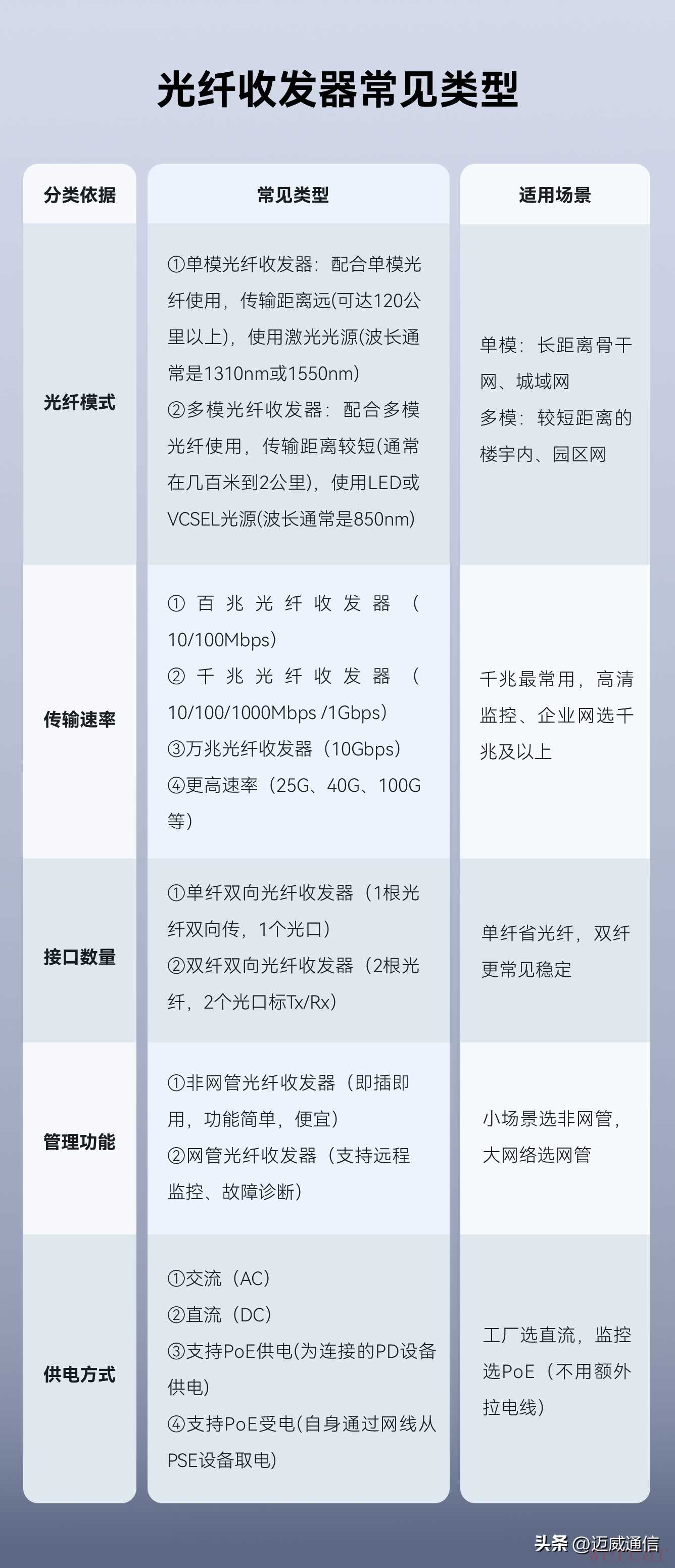安防监控:小区/道路摄像头通过网线接入,光纤传数据到几公里外的监控中心工厂车间:车间设备连接,数据传输稳如泰山校园 / 企业:教学楼、办公楼之间跨距离连网,不用重新布线宽带接入:如光纤到楼后,通过收发器转换到户内网线老设备升级:旧电脑、旧交换机没有光纤口,靠它接入新光纤网络需要长距离传输数据的任何场合~你在哪些场景用到过光纤收发器?欢迎在评论区分享经验~最后划重点:选收发器一定要“配对”!两端的光纤模式、速率、波长、接口必须完全一致,不然信号传不了哦~