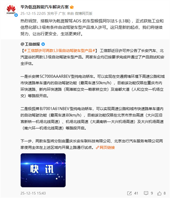热烈祝贺,搭载华为乾崑智驾ADS 的车型极狐阿尔法S (L3版) ,正式获批工业和信息化部L3级有条件自动驾驶车型产品准入许可。这只是新的起点,将继续努力,让出行更安全,生活更美好。